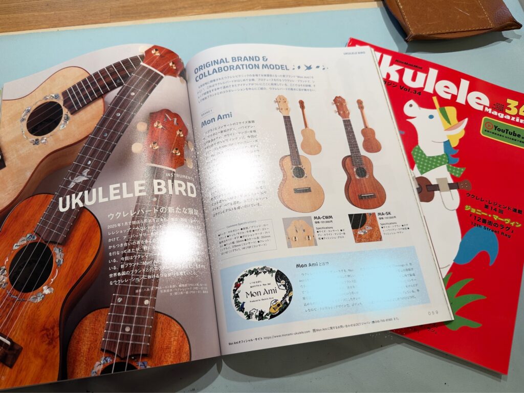 Ukulele Magazine Vol.34 に掲載されました2025-11-21Mon Ami ukuleles were featured in Ukulele Magazine Vol. 34夏と冬、年2回のムックとして株式会社リットーミュージックより刊行されている『ウクレレ・マガジン』2026年冬号に、複数ページ( p58~60)にわたり Mon Ami のウクレレを紹介していただきました。ウクレレレビューにも掲載されています( p26 )。Ukulele Magazine Vol.34